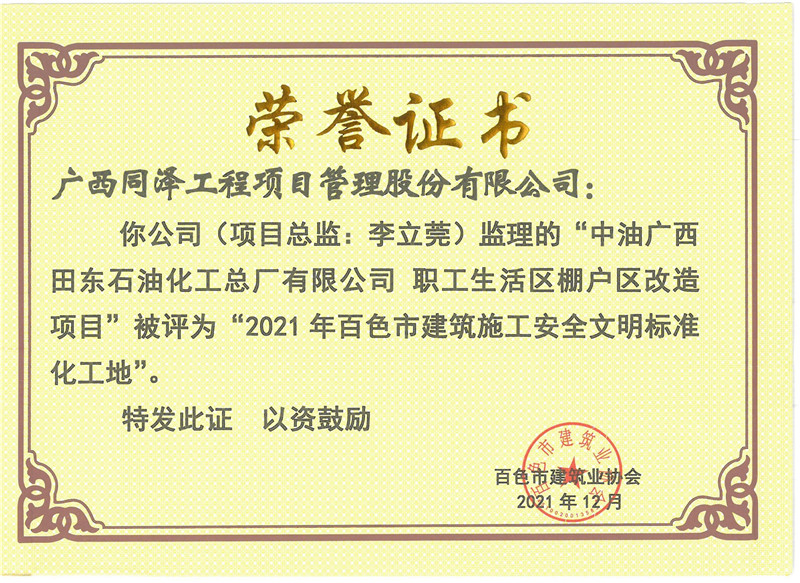 中油廣西田東石油化工總廠有限公司職工生活區棚戶區改造項目榮獲2021年度安全文明標準化工地