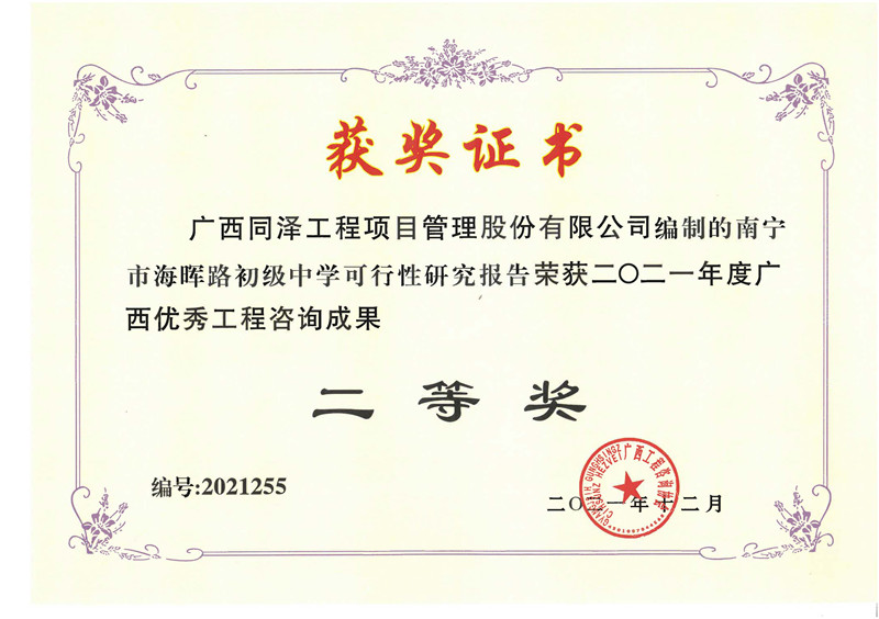 南寧市海暉路初級中學可行性研究報告榮獲2021年度廣西優秀工程咨詢成果二等獎