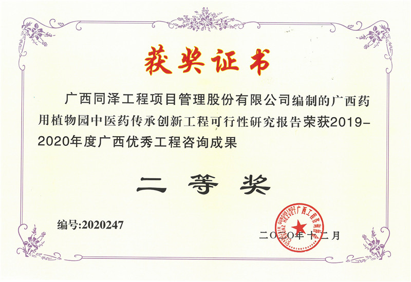 廣西藥用植物園中醫藥傳承創新工程可行性研究報告榮獲2019-2020年度廣西優秀工程咨詢成果二等獎