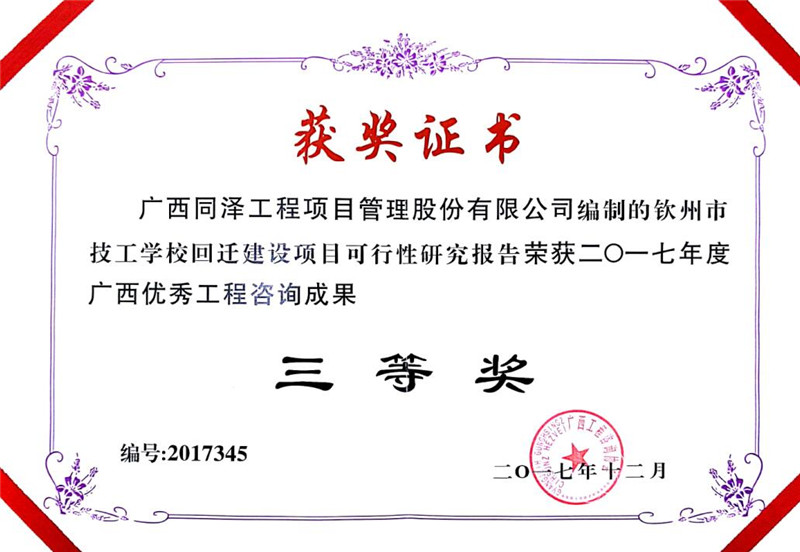 欽州市技工學?;剡w建設項目可行性研究報告榮獲2017年度廣西優秀工程咨詢成果三等獎