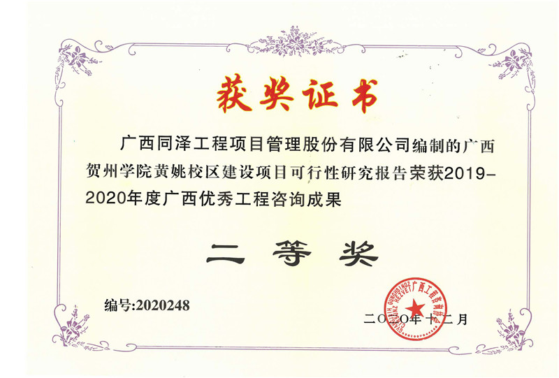 廣西賀州學院黃姚校區項目可行性研究報告榮獲2019-2020年度廣西優秀工程咨詢成果二等獎