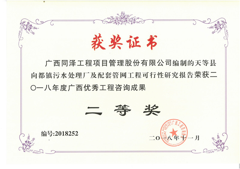 天等縣向都鎮污水處理廠及配套管網工程可行性研究報告榮獲2018年度廣西優秀工程咨詢成果二等獎