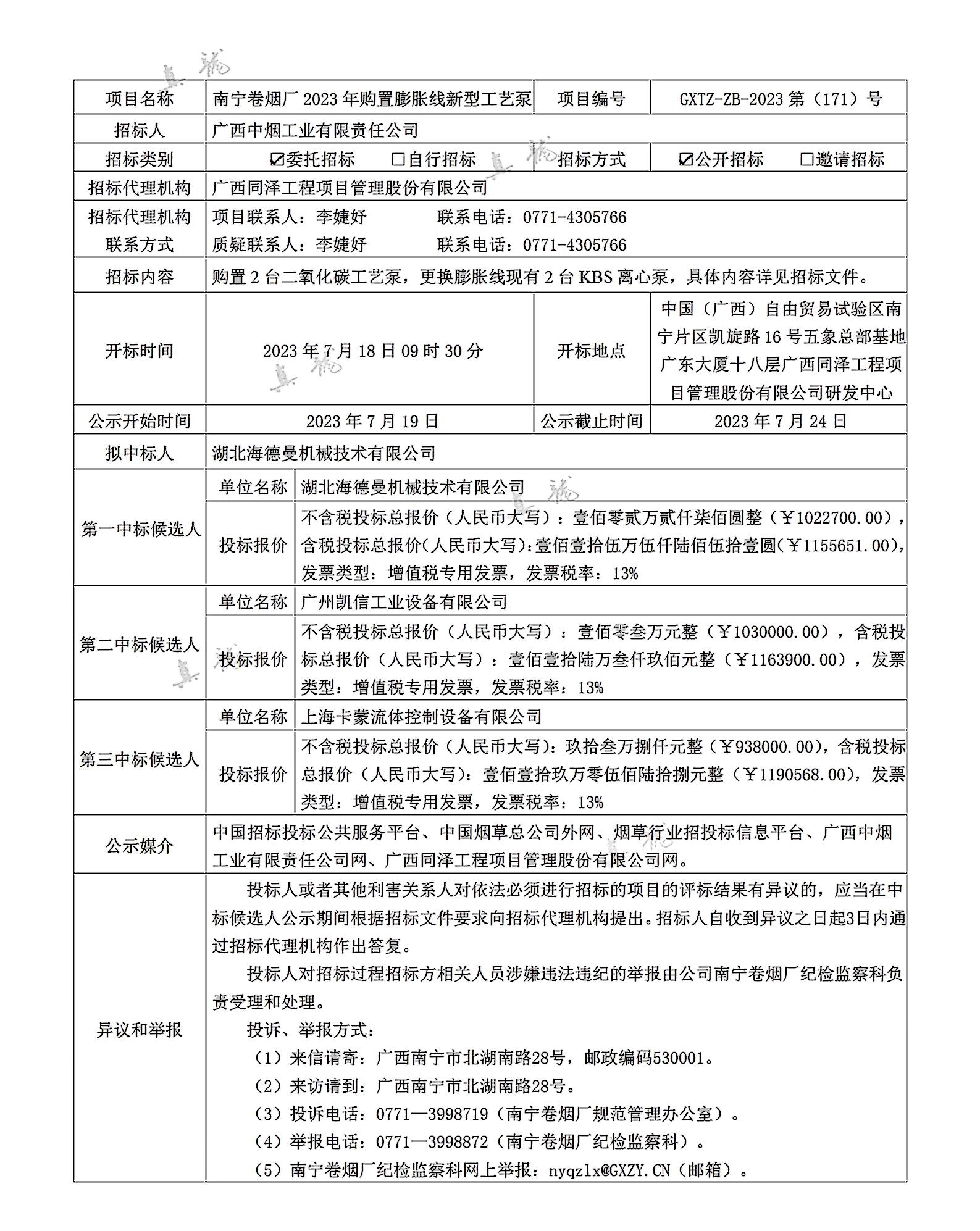 廣西中煙工業有限責任公司南寧卷煙廠2023年購置膨脹線新型工藝泵(項目編號:GXTZ-ZB-2023第(171)號)中標候選人公示