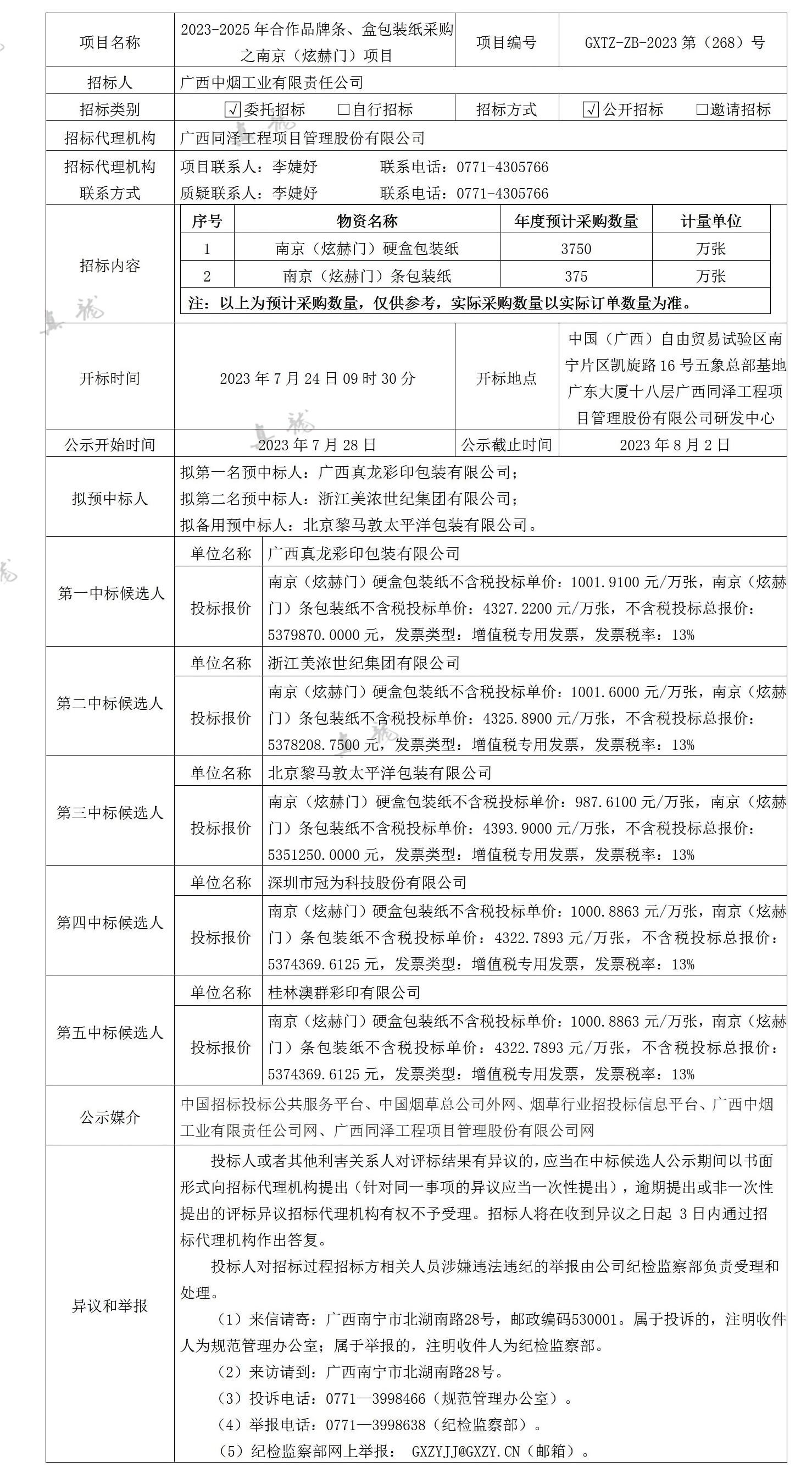 廣西中煙工業有限責任公司2023-2025年合作品牌條、盒包裝紙采購之南京(炫赫門)項目(項目編號:GXTZ-ZB-2023第(268)號)中標候選人公示