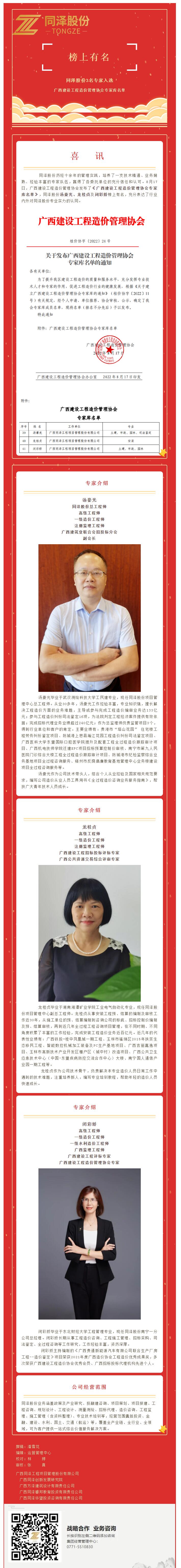 喜訊 | 同澤股份3名專家入選廣西建設工程造價管理協會專家庫名單